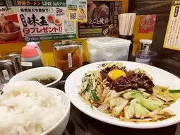 The counter seating offers a view of the kitchen where the vegetables are stir-fried, primarily bean sprouts and cabbage, with offal and a raw egg yolk added at the end. The portion is generous. The stir-fried vegetables are a specialty of the shop, with crispy cabbage and bean sprouts paired with rich and savory offal. On its own, the dish might be a bit salty, but when mixed with the egg yolk and vegetables, it becomes perfectly balanced and pairs wonderfully with white rice. The ramen here also comes topped with plenty of stir-fried vegetables, making it a must-try for ramen lovers.