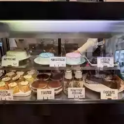 The display case design changes daily, and on this day they had a ribbon cake. π