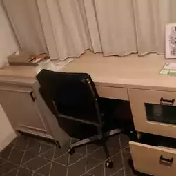 The refrigerator is in the door to the left of the chair. The top drawer on the right contained a kettle and glasses, and the bottom one contained pajamas. The middle drawer contained a USB cable and flashlight.