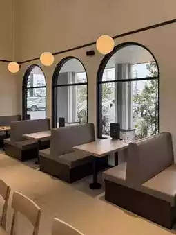 There's a wide variety of seating options, including counter seating surrounding the roastery, chatty booths, and semicircular sofas. Every seat is equipped with an electrical outlet—amazing! ⚡️💡
