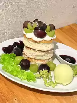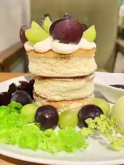 The pancakes are generously topped with Shine Muscat and Kyoho grapes, two iconic autumn fruits 🥞💭