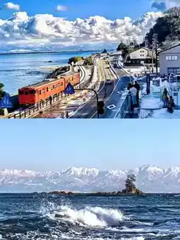 Encounter the classic scenes from JR commercials! From the train window, the Tateyama mountain range and coastline blend perfectly