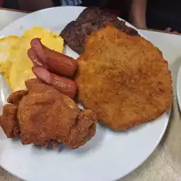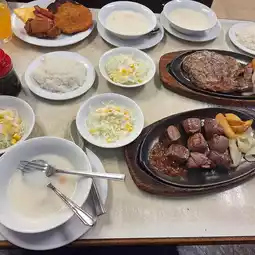 The steak meal includes salad🥗, white soup🥄, iron plate steak🥩, side dishes with onions😭 and potato chips🥔, white rice🍚 or bread🥖