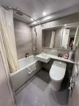 The bathroom is small but has everything you need. The bathroom is small but has everything you need. There is also a bathtub, which is nice to relax after a long trip.