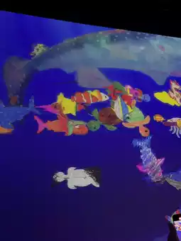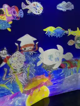 At the exit, there was a service where you could actually color and print pictures of the fish and turtles that were swimming in the aquarium on the large screen on a badge or towel.