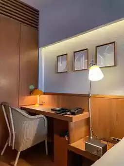 The spacious room had two semi-double beds, a sofa space and a desk.