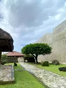 The architecture itself draws inspiration from Okinawa’s traditional Gusuku (castle ruins), blending modern design with deep cultural heritage. Its coral-colored stone and layered structure echo the island’s ancient fortresses, creating a space that feels both powerful and serene.
