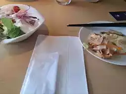 The salad section was clean and colorful, with fresh vegetables. There were various dressings like Japanese-style, sesame, and yogurt, paired with corn, shredded carrots, and beans, making for a refreshing start.
