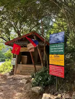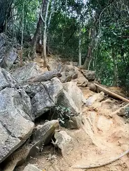 • The path up is almost vertical, requiring you to climb over rocks, using ropes, trees, and bamboo to pull yourself up.