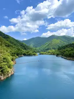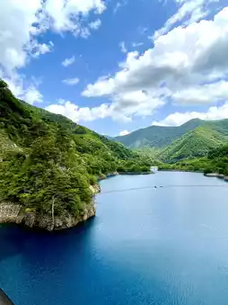 The blue of the sky, the white clouds, the greenery, and the blue of the lake surface are a spectacular sight.