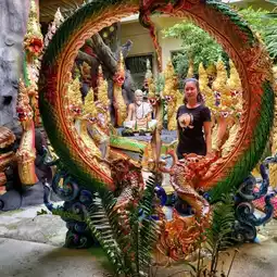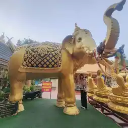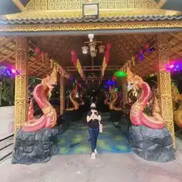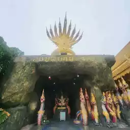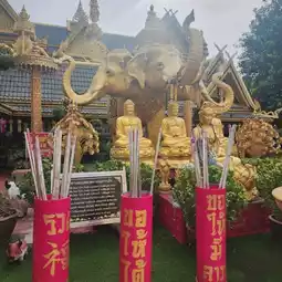 Wat Mai in Nakhon Pathom Province has many worship points, including Rahu, Naga, Thao Thep Suwan, and Guan Yin. The temple has a revered monk with many disciples who come for various rituals such as gold leaf blessing, compassion blessing, and sacred tattoos. There are also many amulets and talismans available for worship, which are very popular among spiritual believers. The temple gets very crowded on holidays, so it's best to go early. The first round closes at 9:30 AM.