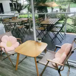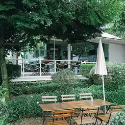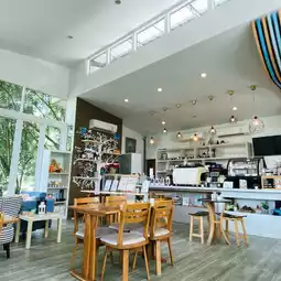 🧁 This small riverside cafe offers a wonderful atmosphere, shady, and incredibly peaceful. The breezy atmosphere is perfect for relaxing or working on a slow day. The cafe is decorated so cutely, with both indoor and outdoor seating. The drinks and food menu, including desserts, are delicious. The coffee is rich and aromatic, and the pastries are freshly made daily. I tried the "Matcha Latte" and "Young Coconut Cake" and absolutely loved them. The food is delicious, and the desserts are excellent, especially the "Bingsu Bua Loi Kai Kem" (steamed dumplings with salted egg). The drinks are delicious. Come in the evening and sit outside comfortably, but inside during the day is even better. There are also plenty of photo spots, whether it's the riverside area, the garden area, or the interior decorated in a minimalist, vintage style. No matter how you take photos, you'll be sure to have tons of Instagram-worthy shots! 😄😍 They even have swings for kids to play on. Overall, almost everything is excellent. I highly recommend stopping by if you're in Nakhon Pathom. You won't be disappointed if you give it a try! 👍🏻👍🏻