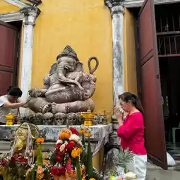 To make a wish, place 2 banknotes on a bowl of water in his hand. Make a wish and give 1 banknote to him. Keep the other banknote as a lucky charm. Ring the bell and circle around 3 times. When making a wish, you should make a wish and pray for it to come true. It is not a vow. It is believed that when praying to Ganesha, you must firmly pray and ask for 1 thing. Then your wish will come true.
