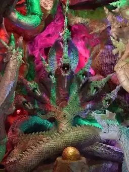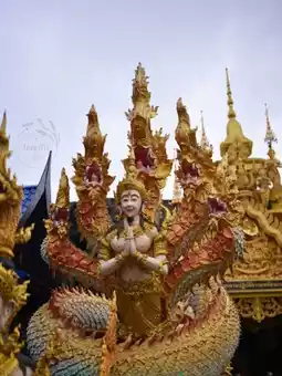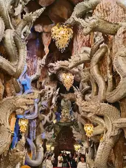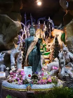 💞 Wat Mani Wong in Nakhon Nayok Province is a stunning temple, renowned for its dazzling golden Naga sculptures, a unique attraction that draws many tourists. The temple's highlight is the 100 Million Baht Ubosot (ordination hall), constructed entirely of marble. Inside, the principal Buddha image in the First Sermon posture and a large Naga statue are enshrined. The Naga Cave, also intricately decorated with carved stone and glittering lights, is a must-see for tourists.