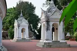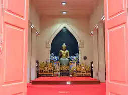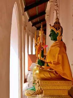In addition to Phra Pathom Chedi, in the lower courtyard to the south of Phra Pathom Chedi and the ordination hall, there is a principal Buddha image, a white stone Buddha image. Which are two of the four Buddha images in the sitting position with their feet dangling, preaching posture, built in the Dvaravati era.