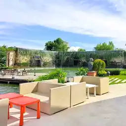 with a waterfall wall, a pond and a flock of small