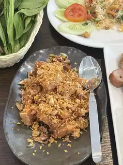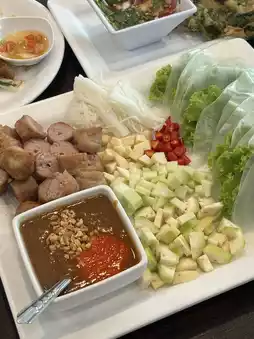 The staff were lovely and provided warm service like going to a relative’s house. There were so many menus, both Thai, Vietnamese, and fusion dishes that I couldn’t decide. In the end, I ordered a set of Vietnamese Miang – thin and soft dough with lots of fresh vegetables, served with grilled pork. The peanut sauce was really good. It was well-balanced and had a fragrant peanut aroma but wasn’t too sweet.