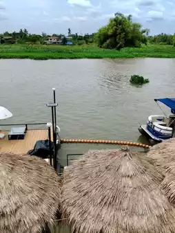 Mong Nam Cafe boasts a panoramic riverside view, overlooking the gentle flow of water amidst nature. 💦 Enjoy the gentle chirping of birds and the cool breeze. Seating options include a cozy, air-conditioned, minimalist interior, or an outdoor area where you can relax, sip coffee, and enjoy the stunning sunset over the river. ☀️