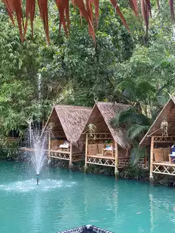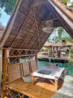 This place feels like dining in a shady garden. The cafe is cute, with colorful blue water and a fish feeding station.