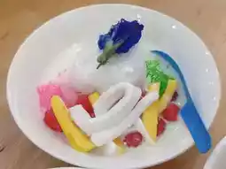 Yoi Yoi Cafe is a charming spot specializing in modernized Thai desserts and fusion-style shaved ice. The cafe is owned by a local chef from Nakhon Pathom who decided to return to their hometown to open this delightful establishment. The highlight of the cafe is its use of palm sugar as a key ingredient in many dishes, giving the desserts a unique aroma and a perfectly balanced sweetness. Each dessert is also beautifully presented, making them visually appealing.