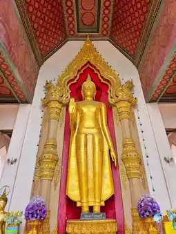 Don't miss the opportunity to pay your respects to Phra Ruang Rochanarit. The standing Buddha image in the attitude of granting forgiveness, enshrined in front of the northern viharn in front of Phra Pathom Chedi, is a sacred Buddha image revered by the people of Nakhon Pathom and believed to be extremely sacred. The temple grounds also offer many other interesting attractions, including the various viharns housing important Buddha images, as well as intricately decorated murals and sculptures. These include beautifully gilded door panels and ancient carved stone statues, all worthy of admiration.