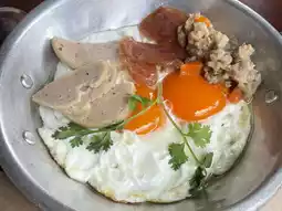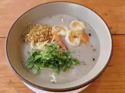 The menu includes rice porridge, pan-fried eggs 🥓, Kham Muan pâté 🧈, Savan-style rice noodles 🍜, dry rice porridge with onsen egg 🥚, rice porridge with toppings, Vietnamese-style grilled meat 🍟, sweet potato noodles, macaroni soup, congee, Vietnamese black coffee, and more ☕️.