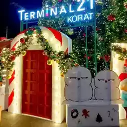 The New Year festival is coming soon. Many places are decorated with Christmas themes. At Terminal21 Korat, it is not out of trend. They have arranged a large Christmas tree in front of the mall. The decorations are very beautiful. There are many beautiful photo spots. The corner of the house decorated with cute lights, the corner of the walkway decorated with twinkling lights, the corner of the gift box corner. There are cute doll standies to be friends to take pictures with. If you pass by, you must stop by to take beautiful pictures.