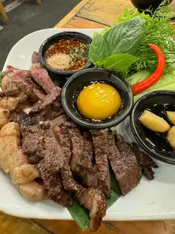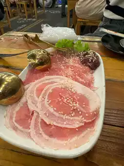 Jim Jum with aromatic herbal soup, extremely flavorful. The dipping sauce is equally delicious. Here, they have Australian beef, pork, and seafood. Order whatever you like. There are plenty of snacks to choose from! There are many to choose from, such as Crying Tiger, Grilled Pork Neck, Fermented Pork, Shrimp in Fish Sauce, Salmon Salad, Fresh Shrimp and Strawberry Salad, Fried Small Intestine with Garlic, Salmon Larb, Fried Pork Belly with Chili and Salt. Everything looks delicious. Just looking at it makes my mouth water. In this cold weather, what could be more suitable than sitting and eating spicy Jim Jum? Hurry up and invite your friends to eat together!