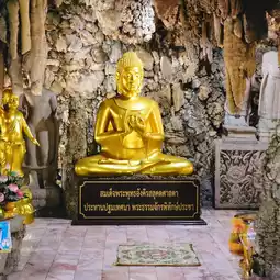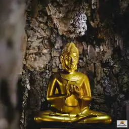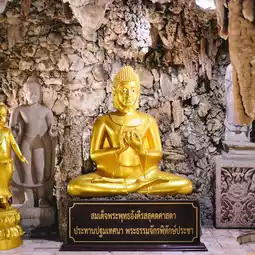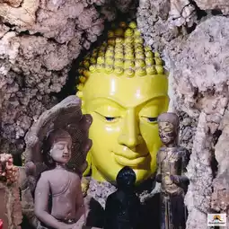 There is a cave with stalactites and stalagmites that were created. The stones used to make stalactites and stalagmites come from blasting mountain rocks to make cement. They were reassembled and modeled into a cave to serve as a memorial and for future generations to visit and study. Inside the cave, there is also an ancient Buddha statue.
