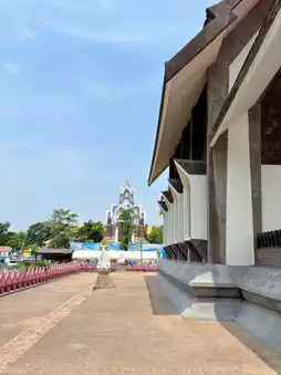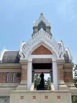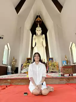 Inside, there's a white Buddha statue and all-white interior walls, creating a clean, pristine, and beautiful atmosphere. The temple grounds are dotted with places for making merit and paying respects.