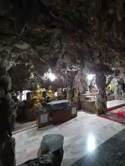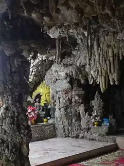 Personally, I really love the interior of the stalactite cave. Upon entering, the stone cave provides a cool, relaxing atmosphere. You can sit and pay respects to the Buddha image. There's also a fish pond, making it feel like you're entering a real cave with water inside.