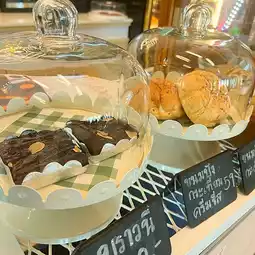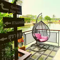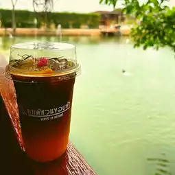 🧸 The cafe I'm going to take you to is Suan Khop Fa Cafe in Nakhon Sawan Province. This cafe has a garden-themed restaurant with a pond and lots of fish. There's an outdoor seating area with air conditioning. The air-conditioned room is cool and comfortable. But today I chose to sit outside because the wind is cool, even though it's a bit hot.