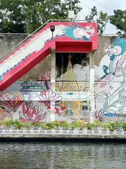 The walls are beautifully painted, and fish food is sold on top. When you buy fish, they lower a rope for you to buy. The kids loved it! You can come here any time, but evenings are best. The weather is pleasant and not too hot. There are also a number of vendors around. This is a must-see when visiting Nakhon Sawan. #NakhonSawanAttractions #NakhonSawanTravel #KhlongYuanChuanRak
