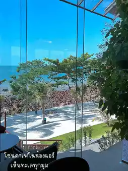 The view is truly dreamy. It's a newly opened cafe, very quiet and private. Perfect for reading a book or sipping coffee by the sea, with a panoramic ocean view. The cool breeze blows without making you feel sticky.