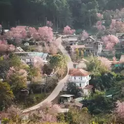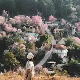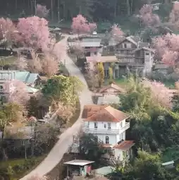 I can tell you that this village is another place that you shouldn't miss. It's very pleasant to walk around. The air is good, the wind is cool, the Himalayan cherry blossoms are in full bloom, bright pink.