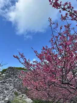 The traces of history and the romance of spring intertwine to create a captivating scene at the ruins of Nakijin Castle. This ancient fortress from the Ryukyu Kingdom era is adorned with cherry blossoms every spring, adding a touch of softness to its solemn stone walls. As you stroll along the castle ruins, the cherry blossoms sway gently in the breeze, their vibrant pink hues contrasting beautifully with the ancient stone walls, as if time has stood still, immersing you in a springtime feast that spans centuries. Climbing the walls and gazing into the distance, the pink sea of flowers and the azure ocean create the most unique spring scenery in Okinawa. Visitors speak softly, afraid to disturb the tranquility of the moment. Standing under a blooming cherry tree, I feel the blend of history and spring, imagining whether the people of the Ryukyu Kingdom once admired the blossoms and gazed at the sea from this very spot. The afternoon sunlight filters through the cherry blossoms, casting a gentle glow on the ancient ruins. The breeze carries the faint scent of cherry blossoms, making the ruins not just a witness to history, but also the most enchanting canvas of spring. This encounter between the ancient castle and the cherry blossoms evokes deep emotions, and I look forward to visiting this beautiful blend of history and spring again next year.