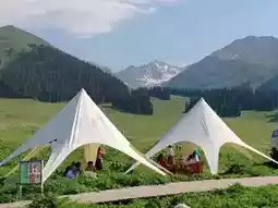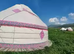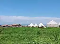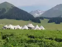 On the vast and boundless grassland, pink and white yurts are scattered, offering visitors a unique nomadic cultural experience for a fee. In the distance, snow-capped mountains stand majestically, forming a magnificent picture with the lush green grass and dense forests. Tourists rest under various tents, enjoying the tranquility and harmony of this place. Everything appears so natural and beautiful, invigorating the soul.