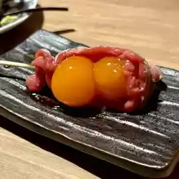Chunky egg yolk inside the wagyu beef. The sweet fat of the wagyu beef matches the rich flavor of the egg yolk. This is a popular signature dish that has become a hot topic on social media.