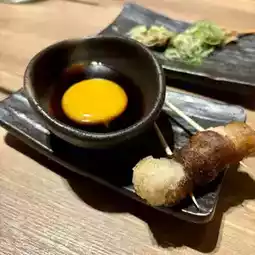 Meat-wrapped rice balls on a skewer. The meat wrapped in sweet sauce is dipped in plenty of rich egg yolk.