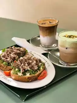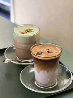 The pistachio cream on top of the Greenery cream latte is so amazing! It's especially amazing because it stretches like cheese. That's why it's so thick🔥❤️ I keep drinking it because it's amazing🥰 The flat white is thick and tastes like I thought!