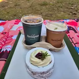 Brique is a cafe with a large garden. There are a lot of outdoor tables in the garden.