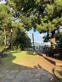 The expansive green grass bathed in soft sunlight creates a picturesque scene, almost like a painting. Scattered throughout the garden are quaint tables and chairs, offering a delightful spot to relax and enjoy the gentle riverside breeze. 🌳