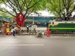 Chongqing's Nanan District, Nanping Street, has a unique street that has recently become popular among young Chinese people and tourists looking for unusual attractions. The street is covered with lush trees that block the hot sun, and the most unique point is the train model set up with a platform, making it a popular photo spot. Inside the train, there are seats where you can buy a juice from a nearby juice shop and relax while chatting. The train, well-built to blend with the asphalt road, offers fresh fun to many tourists.