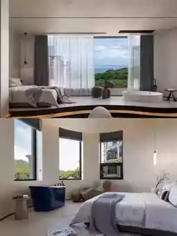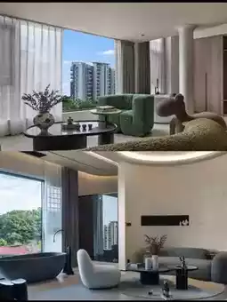 • The designer brought minimalist arches and spiral staircases into the rooms; during the day, sunlight streams through floor-to-ceiling windows, drawing curves on the walls. I recommend wearing a light-colored long dress to play hide-and-seek with the light and shadows at the staircase corners.