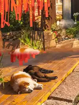 The temple also has two puppies, lying on the wooden floor basking in the sun, and the ducks in the water are leisurely swimming,