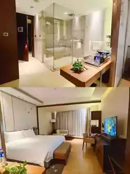 🏠This time I stayed in the hotel's luxury king bed suite, and found that the cloakroom and bedroom space used sliding door design, showing the effective use of space, and the flexible transition between open and closed layout, very good! The hotel has a high floor, the room is spacious, the super large floor-to-ceiling windows, the view is wide, you can see the opposite lake view, the bedding is comfortable, the bathroom is high-end, the hygiene is clean and tidy! The facilities are complete, the super large bathtub 🛁, watching the sunset while taking a bath is so beautiful! Check-in will send drink coupons and fruit plates, go out to play and find that there is a bowl of stewed peach gum in the room!!!