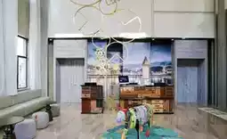 5. In the lobby, you'll see golden skiers descending a towering snow-capped mountain, their faint golden glow illuminating the path ahead. A road through time leads to an unknown world, as if countless travelers have passed through, leaving their mark. Suitcases filled with memories record the passage of time, and a tree of time grows from the treasure trove of memories. The check-in counter in the lobby is designed like a leather suitcase, adding a touch of sophistication and a travel-related theme.