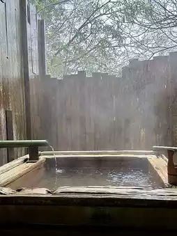 Soaking in the hot spring while enjoying the surrounding green mountains and bamboo forests is beautiful