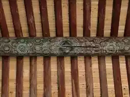 The ancestral hall faces south and sits north, with the Canglang River in front and Maopeng Mountain behind. It measures 35m wide and 53m deep, covering an area of 1,600 square meters. The complex features three halls and two courtyards, with seven rooms across its width, and a hard-top roof built in brick and wood structure. The main entrance has three parallel doors with a hard-top, double-slope roof in an outward-spreading design. A pair of stone lions stands beside the middle gate. Each side gate features a pair of drum-embracing stones carved with flowers representing the four seasons - spring, summer, fall, and winter. The front courtyard measures 14m in length and width. On both east and west sides of the courtyard are corridors supported by 4 stone pillars and 3 moon beams. The middle hall features a beam-lifting wooden structure in the center, with four-room-wide through-tenon wooden structures on both east and west sides. The upper hall serves as the Hu family temple, housing ancestral tablets of past generations, and shares the same structural design as the middle hall, with a beam-lifting wooden structure in the center and three-room-wide through-tenon wooden structures on both sides. Corridors connect the middle hall and the courtyard.