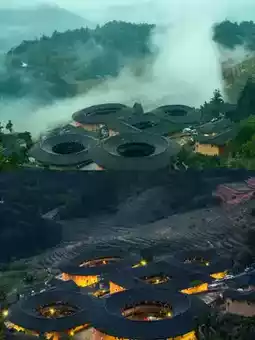 1️⃣ Tianluokeng earthen building cluster: (Four dishes and one soup) Standing on the viewing platform to take photos of the lit-up earthen buildings creates a full atmosphere. If you're lucky, you might encounter a foggy day, which gives the earthen buildings shrouded in mist an even more mysterious feel.